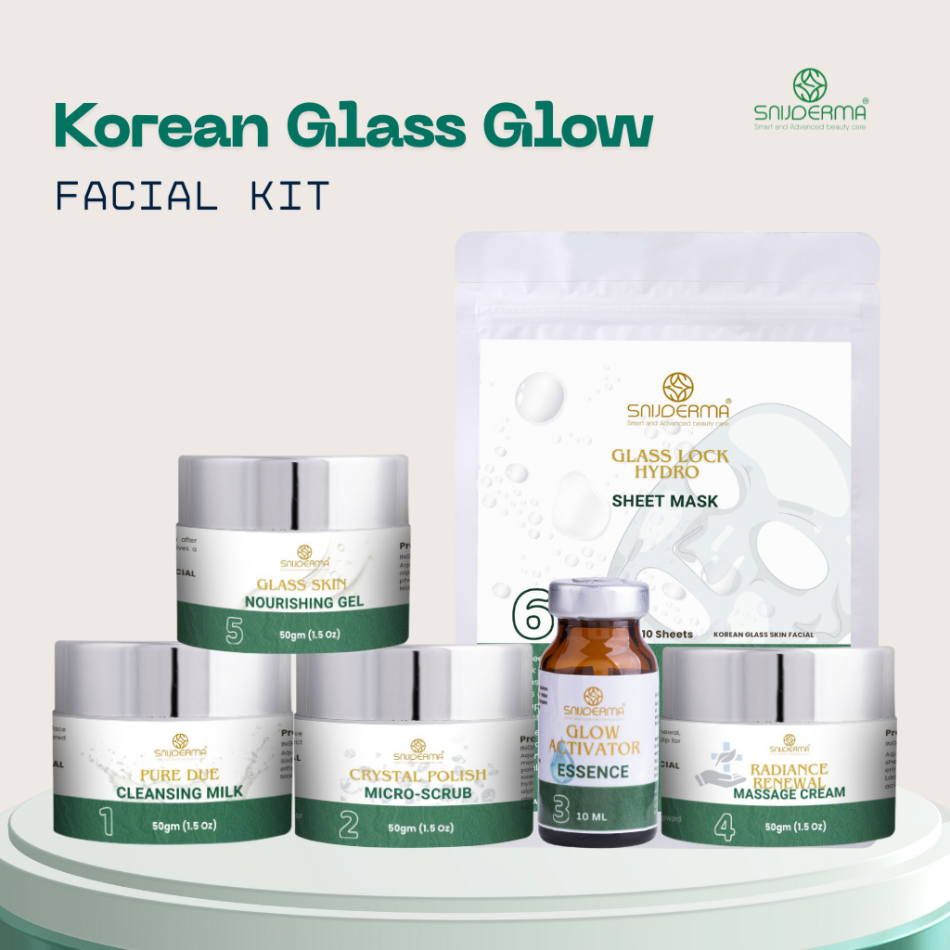 Korea Glass Glow Facial Kit offers you radiantly luminous, smooth, and well-hydrated skin with its comprehensive professional facial set, which provides the best Korean glass skin experience. The expert 6-step facial kit thoroughly cleans, exfoliates, and hydrates your skin, giving it the translucent glow that is now possible only in Korea.